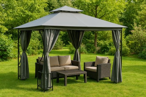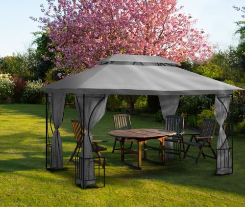 Zadaszenie oraz ściany wykonano z wytrzymałej oraz odpornej na warunki atmosferyczne tkaniny poliestrowej (160 g/m²) w eleganckim szarym kolorze