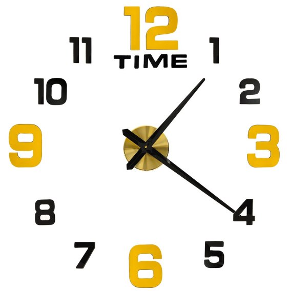 Cyfry zegara są w żółtym i czarnym kolorze, wskazówki są czarne, a